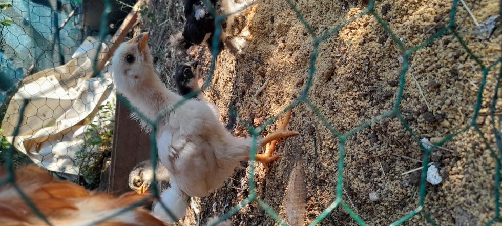 L'altro giorno la chioccia è entrata con i pulcini nel recinto delle galline, poi è uscita portandosene dietro quattro, perché uno si era bloccato nell'angolo di rete, dove non riusciva a capire come uscire. La chioccia inizialmente si è arrabbiata e ha cercato di farlo uscire, ma poi gli altri si sono allontanati e lei li ha seguiti, lasciando lì il piccolo di cocincina nana (detto, da mio figlio piccolo, Willy) a pigolare. L'ho salvato io, ma se non me ne fossi accorto e se la gallina ultima in gerarchia fosse stata lì dentro (unica interessata ad attaccare i pulcini, ma che viene continuamente beccata dalla chioccia) sarebbe potuto morire.