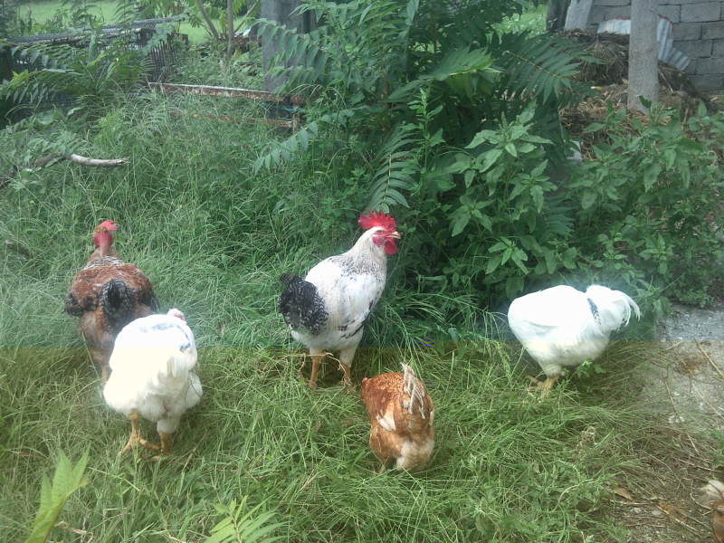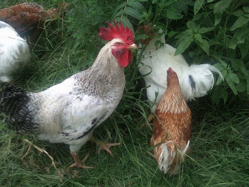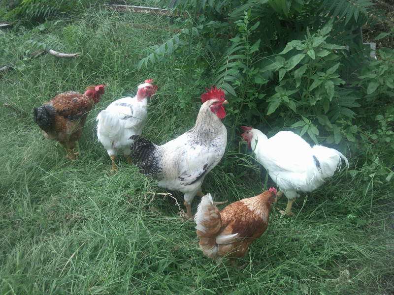In queste foto alcuni dei miei galletti, ibridi commerciali, mentre trascorrono la loro giornata... Il capobranco (quello bianco striato nero) porta i segni sulla cresta di una serie di combattimenti con il capobranco dei tacchini! Ora hanno fatto pace...