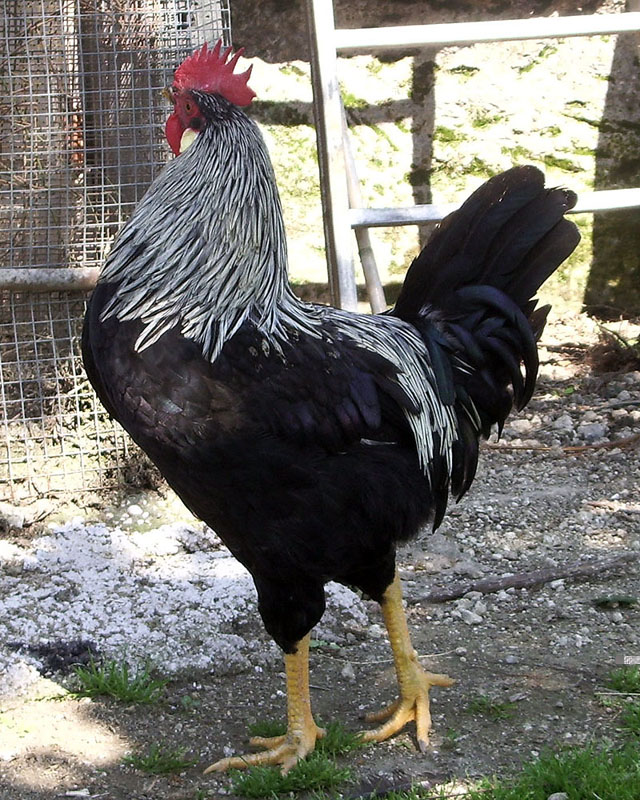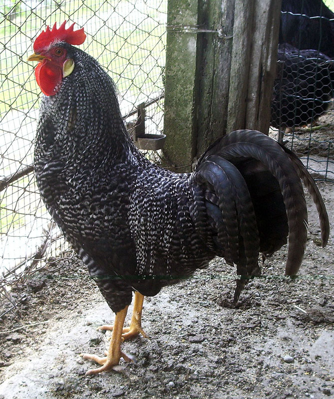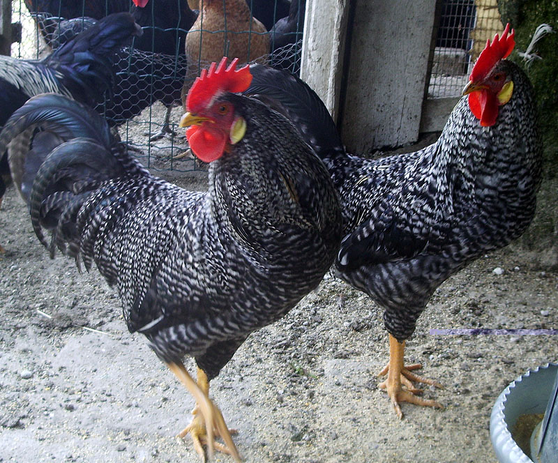 Il secondo gallo ha molte caratteristiche della Livorno barrata, colorazione molto rara. Se ti vuoi impegnare in un qualche tipo di selezione potresti cercare 2 galline Italiane barrate e 2 Livorno nere e secondo me qualche risultato in qualche generazione arriverà!
