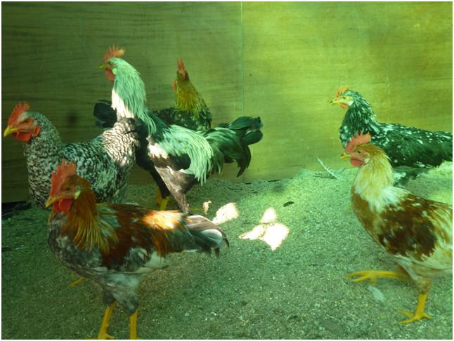 Sembra intavedersi un Italiener dorato blu o Livorno collo oro blu, un Livorno collo argento oppure Italiener argento un Ancona nero picchiettato di bianco. Il soggetto sulla destra rosso è ibrido . Gli altri si vedono male. Vedo un barrato ma non si vede il corpo, potrebbe essere un Amrock.