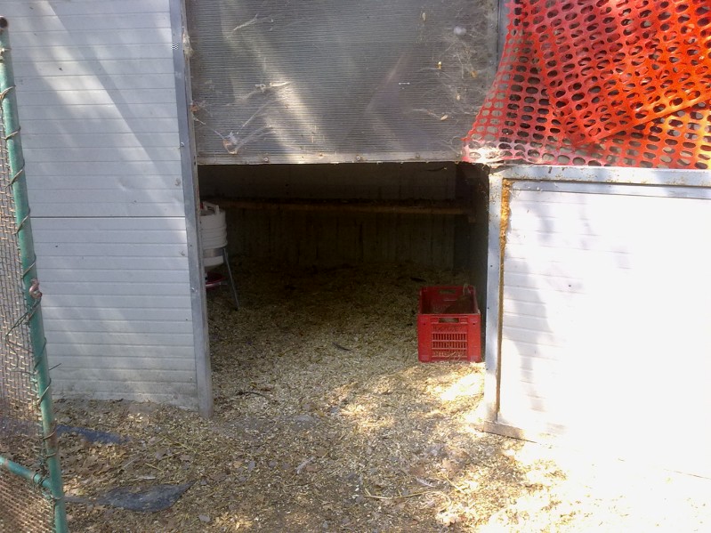 Questo è l'interno con vista su uno degli altri due recinti interni. Attualmente non avendo necessità di tenere gruppi separati gli altri due recinti interni sono comunicanti tra loro tramite l'apertura del cancellino di divisione in modo che abbiano entrambi i recinti per razzolare.