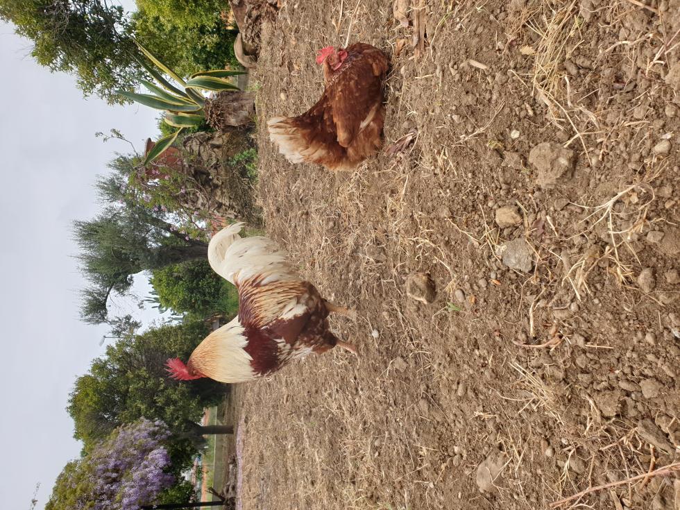 Questa in primo piano è la gallinella dell'anno scorso, figlia del gallo sullo sfondo e della chioccia.