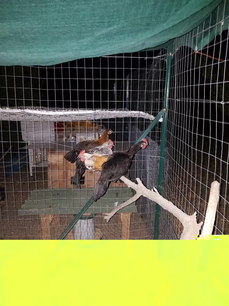 Romagnoli che hanno subito deciso di dormire all'aperto mentre i pulcinotti di Marans cresciuti finora in gabbia si erano scelti un angolo a terra, col buio li ho presi e messi sui posatoi speriamo capiscano..