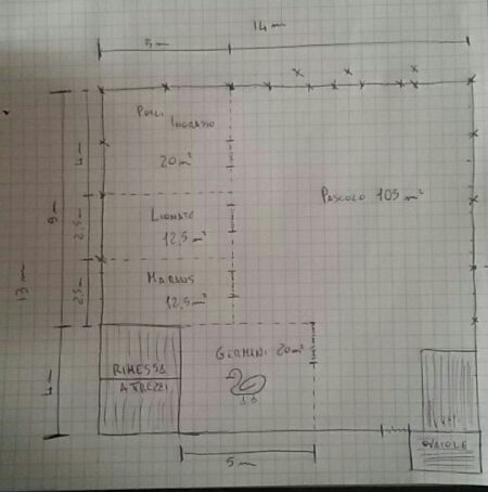 Ora vi posto una foto del proggetto che ho buttato giù nel pomeriggio.. È uno schizzo a penna spero sia comprensibile.. Sarà un recinto grande che poi conterrà al suo interno alcuni più piccoli.. Che finirò di realizzare con calma quando diventeranno necessari..i primi da realizzare saranno quelli per i pulcini fino ai 4 mesi che poi andranno con le ovaiole se galline o in pentola se galletti, e quello dei Germani..mio figlio ci tiene troppo ma io nn voglio proprio che stiano con le galline..quindi avranno un recinto il più vicino possibile a casa di modo che lui possa vederli sempre.. Un abbraccio a tutti..