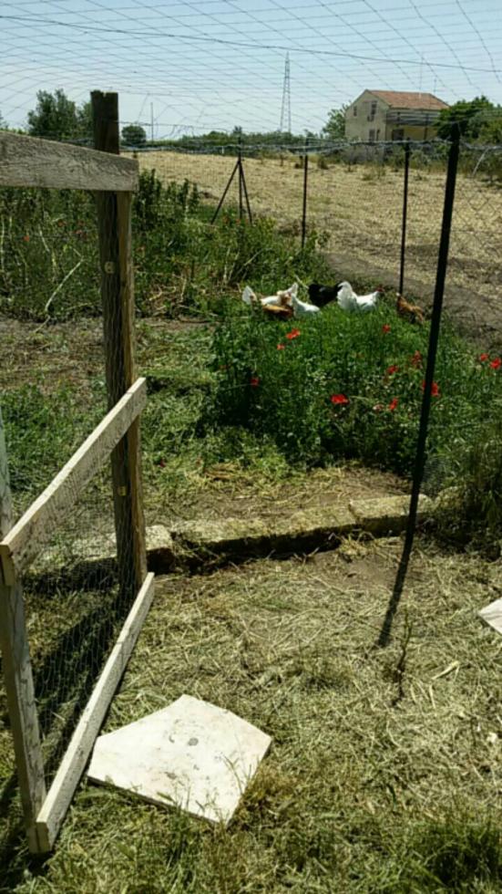 Ora mi evo dedicare un po alla vigna..ma appena finisco tiriamo su la rete per la suddivisione interna come da proggetto..anche perché i pulcini crescono velocemente e hanno ormai un mese e cinque giorni..prima dei due mesi vorrei liberarli in un recinto solo per loro..circa 20mq..le ovaiole hanno già apprezzato il loro nuovo pascolo, anche perché ci sono ancora le piante delle fave con qualche ultimo baccello e piene di insetti vari..