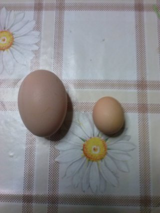 pietroc . quello grosso e un uovo normale di gallina di nanina e un po piu piccolo ,quello piccolissimo e grande come 10 centesimi sembra di quaglia nessuno me lo aveva fatto cosi piccolo , sara una nanina che a fatto il primo uovo