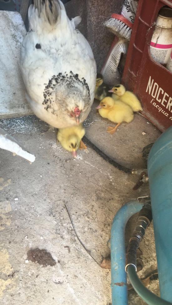 Ahah ma non ne potevo più di vederla seduta eravamo arrivati a 4 mesi e alla fine si è alzata solo quando si è ritrovata sotto 5 anatroccoli. Comunque i pulcini bianchi sotto la chioccia sono degli ibridi? Sono veramente bellini..