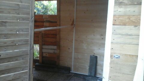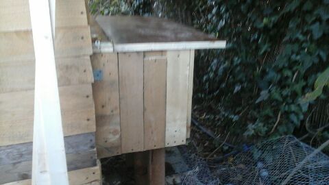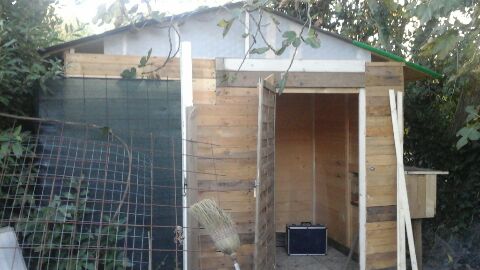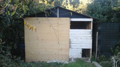 Buonasera, vi presento il mio primo pollaio, che sto costruendo da zero passo passo. Si tratta di una struttura fatta di legno in parte recuperato, di 3mt×2 alto nel punto massimo 3 mt, i due nidi esterni sono 40×40×40 circa. Devo ancora capire bene come mettere i posatoi.