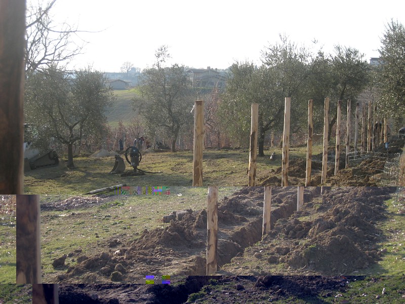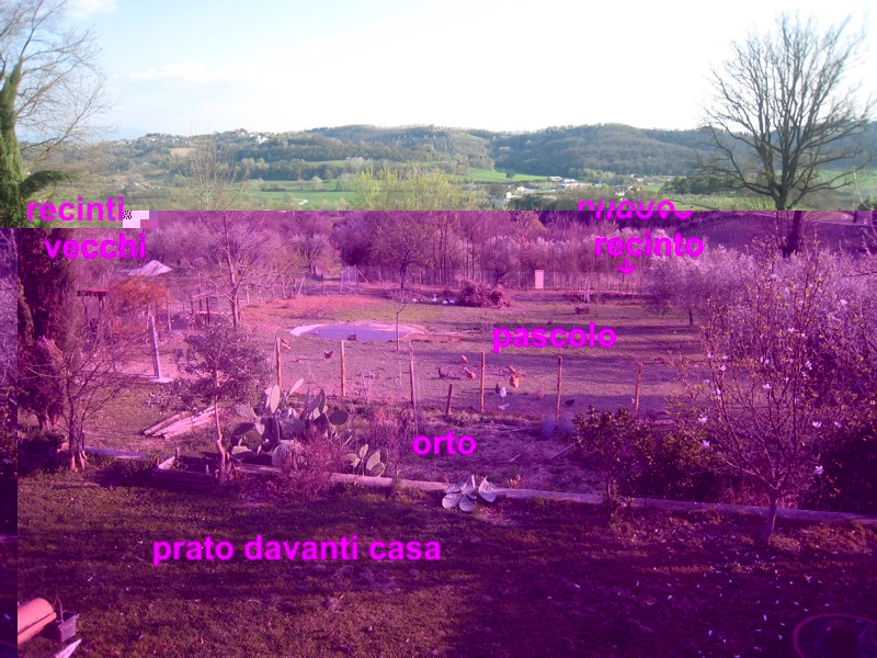 Zia Rina posto qualche foto della recinzione, come accennavo i lavori sono in corso, bisogna completare il recinto nuovo, portare acqua, elettricità, costruire la casetta, mettere le reti. Inoltre anche l'acqua accanto al laghetto così quel tubo verde sparisce. Ho messo una foto d'insieme scattata dal piano di sopra, la recinzione è impossibile vederla tutta perchè è molto vasta ma puoi avere un'idea. Non è una rete antipredatori ma tiene alla larga i CANI che sono gli animali che mi hanno causato finora i maggiori danni. Penso che anche una volpe di giorno possa essere un minimo contrastata. I pali sono alti 2,5 metri e la rete fuori terra è di 180 cm. Polli, anatre e oche vivono tutto il giorno liberi, la sera tutti a nanna nei recinti bunker che sono all'interno della recinzione perimetrale.