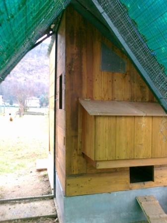 Rispondo alle vostre domande. Il tetto è così inclinato perché ero partito con l'idea di fare un pollaio ad arca, come quelli che si trovano in commercio, quindi per praticità nel fare la struttura in ferro l'ho realizzato in quel modo. La porta serve per chiudere le ragazze la notte nel parchetto interno, perchè è vero che il pascolo esterno è recintato, ma girano le volpi la notte e una recinzione di un metro e mezzo è scavalcabile. Non è in montagna, è comunque in zona prealpina, in provincia di Varese, a 300 m slm.