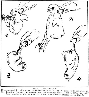 Se tenete sospeso il pulcino dalla nuca, come mostrato nella figura n. 1 e 3, alcuni si piegano in su denotando di essere femmine; o si stirano dimostrando di essere maschi.