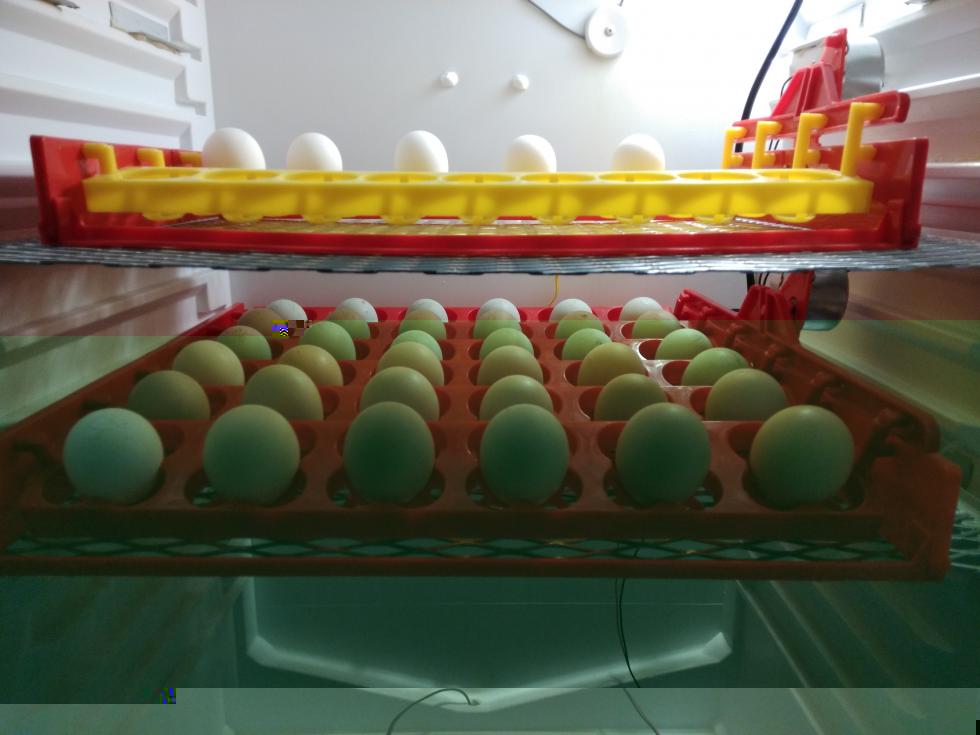 In basso il compartimento di incubazione e in alto la camera di schiusa. I due ambienti hanno umidificatore e termostato indipendente più ampia finestra a doppi vetri per godersi il viaggio. In questi giorni finita la taratura degli strumenti, si testa con 60 uova!