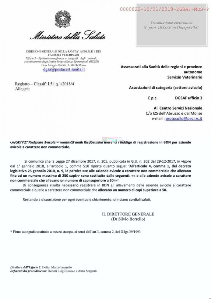 Dal 2013 in Italia è stata istituita una anagrafe avicola informatizzata dove sono registrati e geo-referenziati tutti gli allevamenti di una certa dimensione. Inizialmente ne erano esentati gli allevamenti rurali al di sotto dei 250 capi. Lo scorso dicembre – proprio per far fronte alle continue emergenze sanitarie – tale limite è stato ridotto a un quinto. Di conseguenza dal 1° gennaio 2018 tutti gli allevamenti, anche se familiari, con un numero di capi avicoli superiore a 50 dovranno obbligatoriamente iscriversi alla BDN.