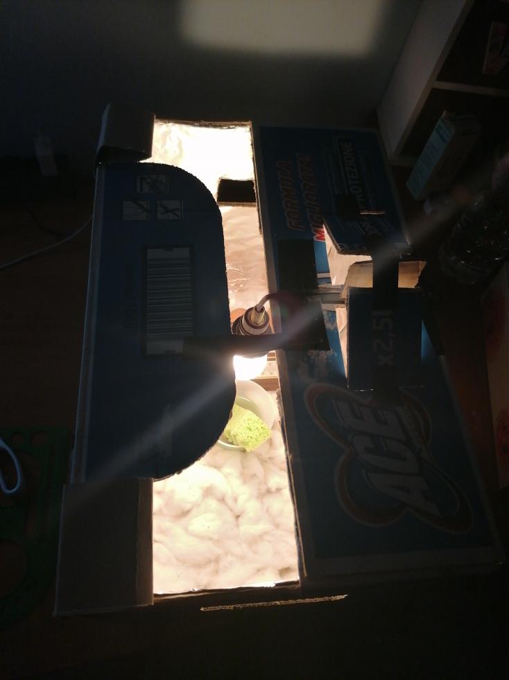 Salve, ho creato un incubatrice con cartone, all interno rivestito con carta alluminio. Lampada appesa al centro del cartone. Ovatta alla base. Contenitore con acqua e una spugna. Ho lasciato il tetto semi aperto, va bene? Grazie. Angelo
