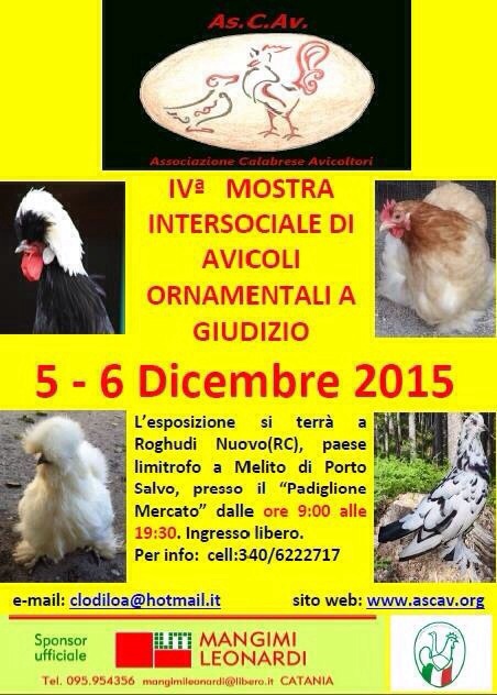 Anche quest'anno l'ASCAV - Associazione Calabrese Avicoltori - è lieta di invitarvi alla ormai consueta esposizione a giudizio di razze avicole ornamentali giunta alla sua quarta edizione: galline, anatre, oche, colombe particolarissime e originarie delle regioni più disparate del mondo.Un'esposizione di biodiversità avicola. Alla mostra intersociale esporranno allevatori calabresi e delle regioni limitrofe. Non perdetevi questo evento. Ingresso gratuito.
