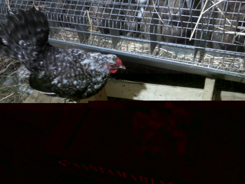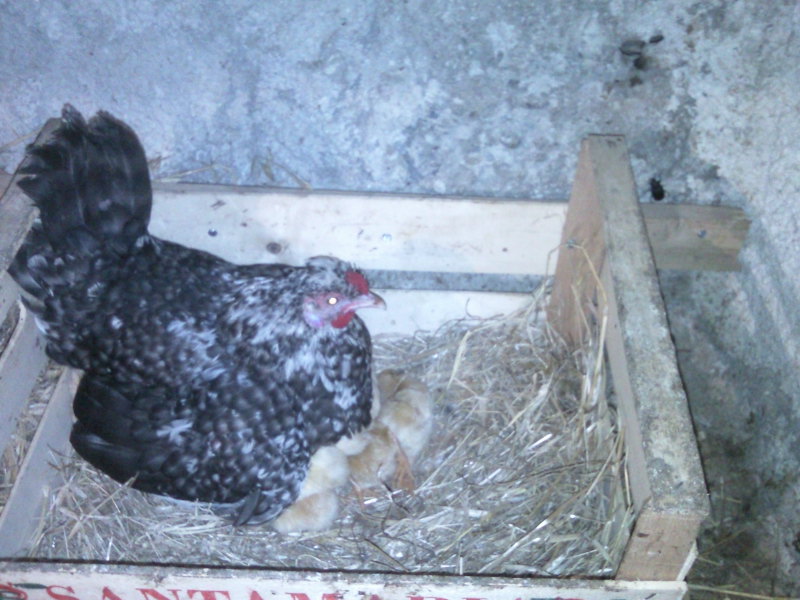 2)chioccia ibrida che ha fatto 13 pulcini, all'eta di 1 mese abbiamo comprato 20 pulcini di un giorno che abbiamo deciso di affidare a lei, togliendole i pulcini.
