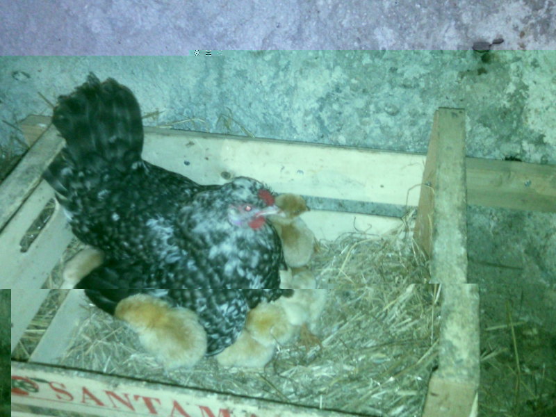 1) una americanella molto vecchia che ha fatto un solo pulcini malato, perso dopo 3 giorni, ha adottato un pulcinotto di un mese, che ha trattato come se avesse anche lui 3 giorni, nel senso che lo copriva sempre e gli passava il cibo dal becco e così .