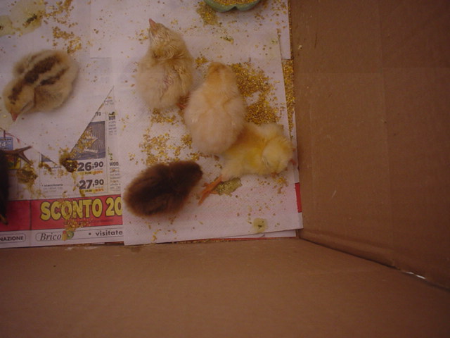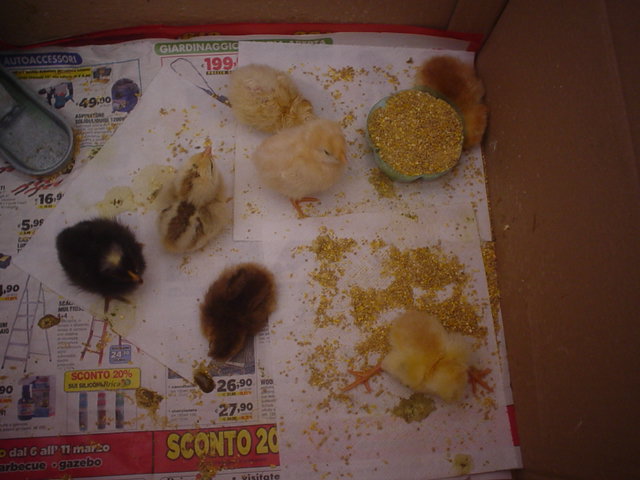 Siamo a quota sei pulcini, per il momento sono nati solo gli ibridi nani, le uova avute da un amico non sono gallate (10 su 10) mentre le altre 10 avute da un conoscente sono risultate tutte fertili, adesso aspetto che nascano tutti. Gianluca non ho visto che tipo di polli alleva questo conoscente, mi sembrava uno spreco far funzionare la real 24 con solo 10 uova e quindi ho chiesto in giro le altre uova, dalle dimensioni delle uova 6 su 10 sono di nanette, cambia anche il colore dei gusci e come hai visto dalle foto un pulcino nero, due gialli e uno vari colori, i due che sono ancora nell'incubatrice (sono nati nel pomeriggio) sono diversi come colori. Saluti eustachio.