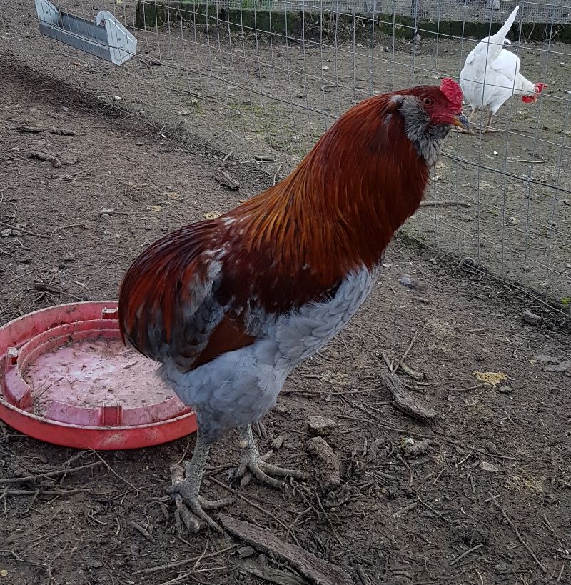 Riproduttori Aracuana 7 mesi.. Il gallo ho potuto sceglierlo tra due bei maschi uno selvatico e l'altro blu selvatico..ho scelto il blu, tenevo alla colorazione ma era oggettivamente il maschio migliore.. Peso 2,130kg cresta buona presenza di barba assenza di coda.. La femmina la scelta è stata forzata in quanto unica femmina..colorazione selvatico.. Pregi bel colore dell'uovo buona forma..difetti la stazza leggermente legera 1,445kg (dovrebbe arrivare almeno a 1,6..) l'assenza di barba..