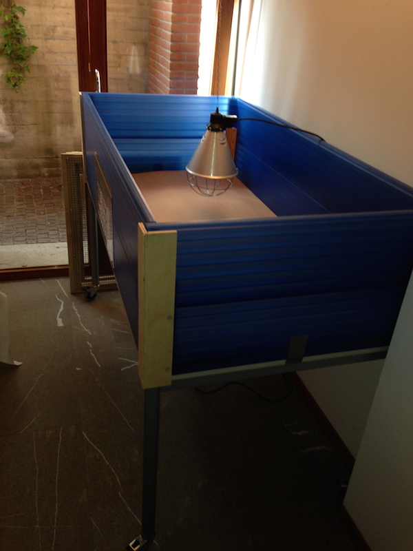 L'alloggio l'ho costruito utilizzando cose di recupero che avevo in giro. Un tavolino con rotelle, doghe blu rimaste da un vecchio intervento, cartone pesante