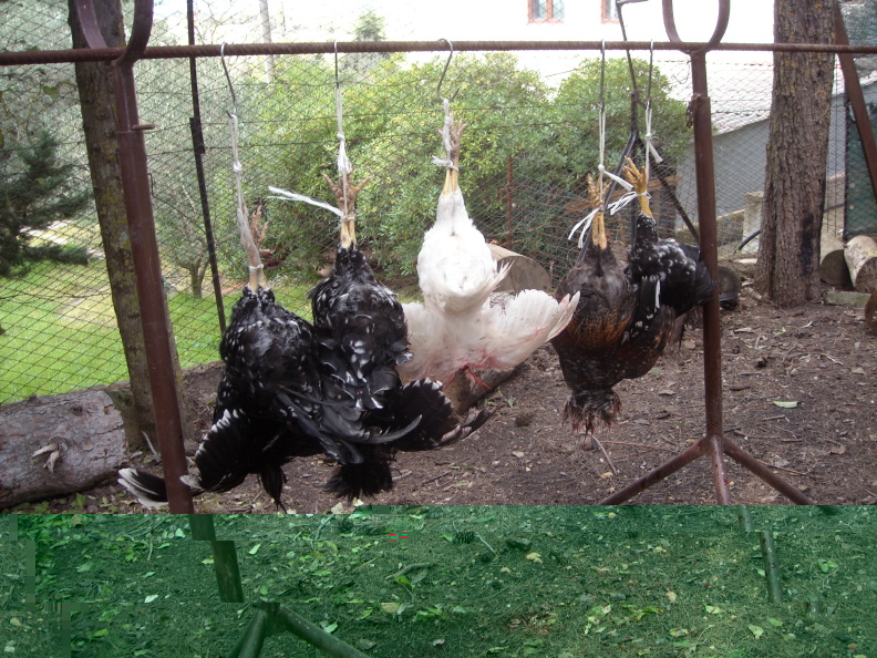 Ho una domanda dopo aver visto la quarta foto (quella col gallo e il fucile): come fai a metterlo in posizione e a tenerlo così a lungo? Io ho un gancio sotto la legnaia di mio nonno e li appendiamo per le gambe.