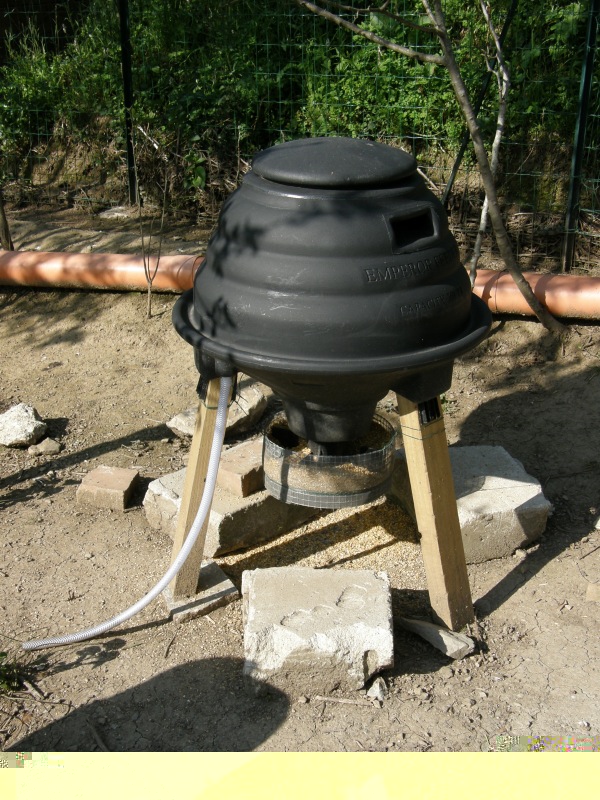 Questa è la mia mangiatoia che ho comprato, è molto capiente (70 litri), è fatta in modo di proteggere il mangime da pioggia e ratti e ha un sistema di drenaggio dell'acqua piovana composto da un tubo.
