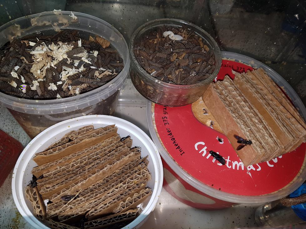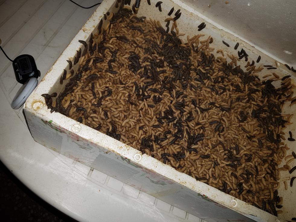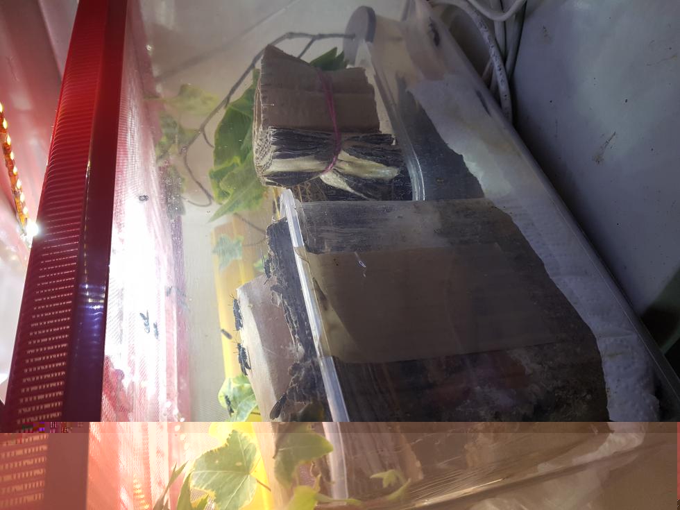 È per me una sorta di grattacapo questa foto.Un cartone pulitissimo,delle lastre in PP completamente gialle e le fermmine di hermetia impazzite che depongono in tutti i buchi.