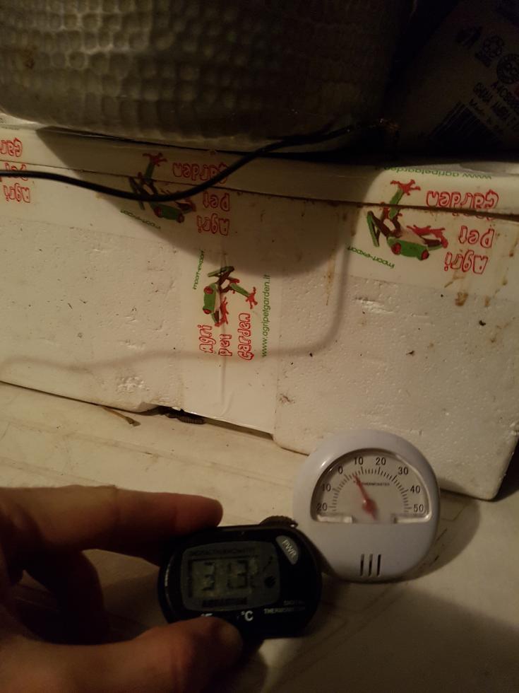 Notare le differenza tra temperatura interna ed esterna, purtroppo questa condizione non dura troppo se le temperature sono troppo rigide, in questo caso per 1 settimana hanno resistito, perdendo 3-4°C al giorno, ma la medesima temperatura invece continuano a mantenerla nell'optimum se poste in ambiente riparato, in questo caso in box e non più all'esterno; Inoltre il polistirolo ha ridotto notevolmente gli odori sviluppati dalla degradazione del cibo.