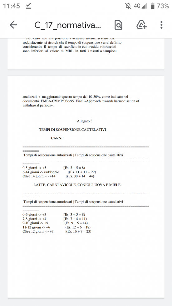 Per gli animali da reddito quando si utilizza un farmaco fuori etichetta, il tempo di sospensione – cioè il periodo che deve intercorrere tra l’ultima somministrazione del medicinale e il momento in cui è possibile macellare gli animali e utilizzarne i prodotti – non è noto, perché non è stato studiato per quella specie. Questo intervallo è infatti stabilito sperimentalmente e viene indicato sulla confezione del medicinale. Se il veterinario utilizza il farmaco in deroga è obbligato a utilizzare dei tempi di sospensione “cautelativi”, di cui nella foto che allego.