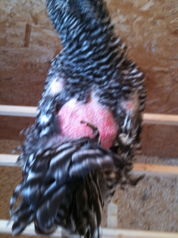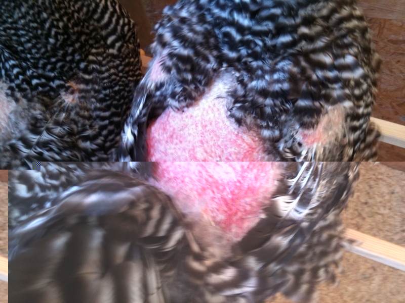 il primo è che una gallina ha perso il piumaggio sul dorso e qualche penna alare, portando in vista il colore della pelle, che a differenza di altre che di solito hanno un colore rosaceo e vi è già la ricrescita del piumino, in questa la cute è molto più rossa quasi sanguinolenta.