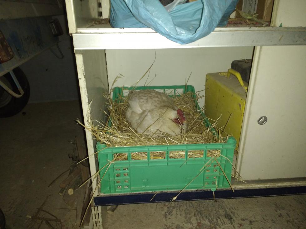 Questa mattina, al 17 giorno di cova, ho notato un uovo rotto che fuoriusciva in parte dalla gallina. Quindi l'ho tolta dal nido e l'uovo era stato rotto da poco. Quello che non andava però, è che a furia di girare le uova, aveva asportato tutto il sottofondo verso l'alto e le uova poggiavano sulla cassetta in plastica nuda.
