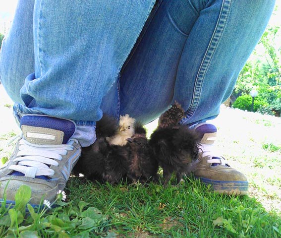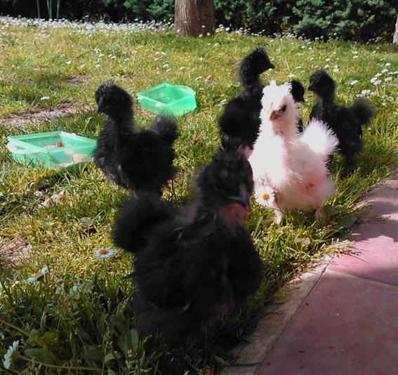 Si infatti faro' un piccolo recinto con quella rete per meta' ombreggiante. IL gatto l'ho anche io ma e' talmente grasso e nullafacente che non gli interessa assolutamente niente dei pulcini. Eccoli qua, e io in qualita' di chioccia