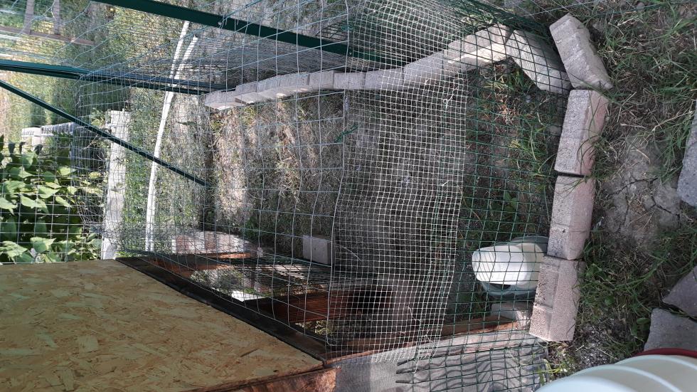 Chiuso con rete a maglia piccola e protetta da sopra contro attacchi di rapaci o altre intrusioni.