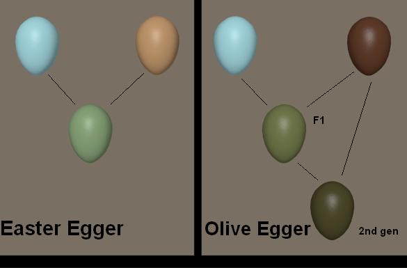 Il gene Olive (O), che causa il colore azzurrognolo delle uova, è dominante. Se incrociato con una gallina che depone uova bianche la prole produrrà uova di colore azzurro, se invece viene incrociato con galline che depongono uova rosa la prole produrrà uova verdi. Se invece viene impiegata una razza come la Marans o la Penedesenca che produce uova color cioccolato il risultato saranno uova color verde oliva intenso. http://www.summagallicana.it/Volume3/C.VIII.b.htm