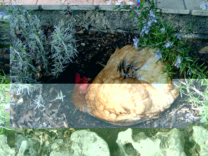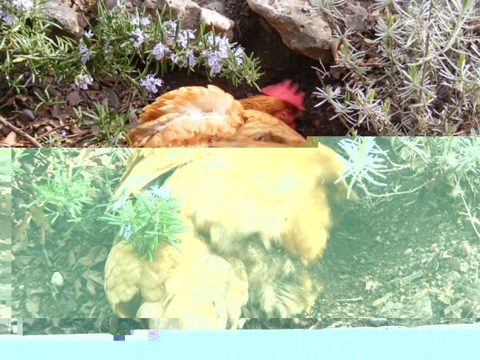 Ecco la mia Rebecca mentre si fa il bagno di terra, che sembra piacerle moltissimo, come dimostrano i suoni gutturali che emette mentre si lancia terra sulla schiena raspando con le zampette. Anche sua sorella Linda lo fa, anche se un po' meno. Quello che mi chiedo è se il fatto di fare i bagni di terra è un sintomo di infestazione da parassiti, o le galline lo fanno comunque? é il caso di spruzzarle con dell'insetticida?