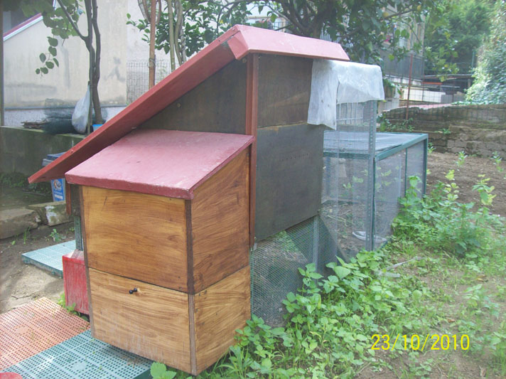 la zona con tetto spiovente è su due livelli dove il piano terra si razzola ci si nutre e il piano rialzato accessibile con passarella è adibito a zona notte con annesso nido. In quest' ulitimo la mia gallina brahma sta covando delle uova gallate da me acquistate (una decina buone)