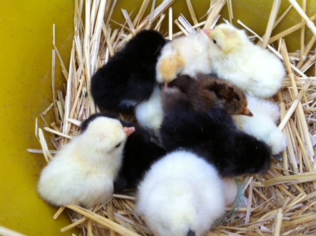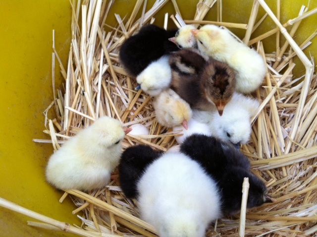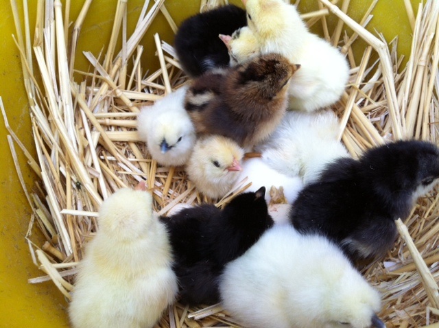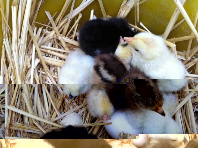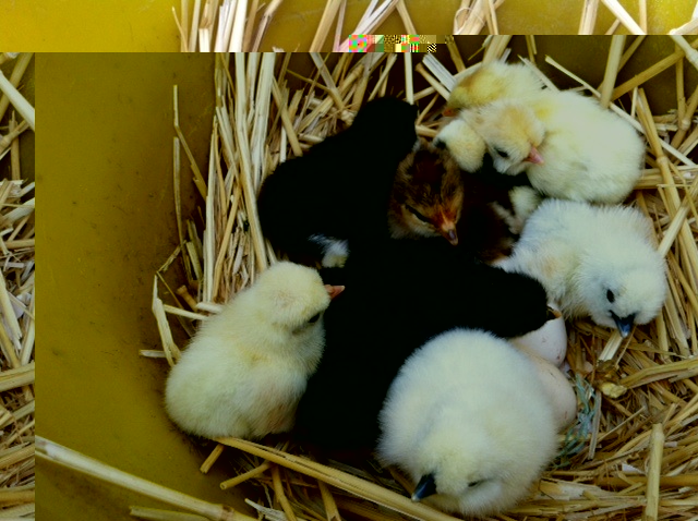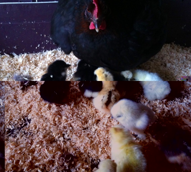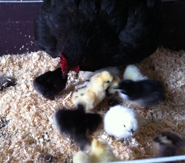 Chioccia ibrida con mix di pulcini di razza Moroseta, Siciliana, padovana nana e olàndese ciuffata nana.
