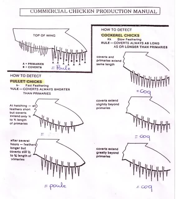 Si effettua il sessaggio alla'ala entro sei ore dalla nascita perche è piu facile riconoscere le femmine avendo rispetto ai maschi (come per esempio nei broiler)velocita di impennamento maggiore rispetto ai maschi....con il passare dei giorni il sessaggio puo essere effettuato ma a volte ci si sbaglia data l'elevata crescita che hanno giornalmete i soggetti e lo sviluppo delle masse, piumaggio ecc..  ....