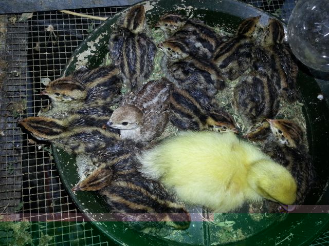 Ciao, la mia ultima incubata: 13 quaglie, 1 anatra muta e 1 starna (veramente questa me l'hanno regalata )......tutti pensano che l'anatra sia la loro mamma e la seguono sempre!