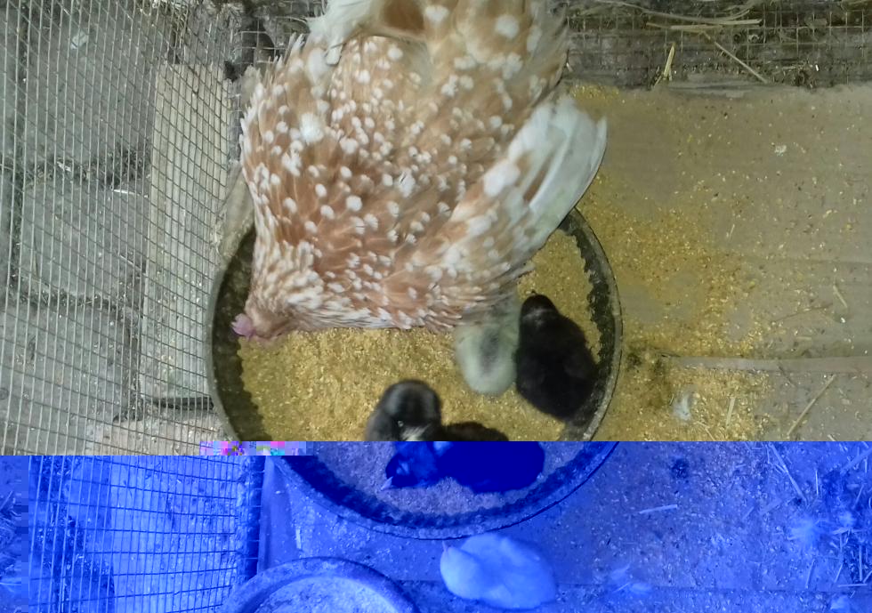 Ecco i primi frutti del mio gruppetto di ibridi da carne barrati. Le uova erano 9 di cui 7 fertili, ma 1 non è riuscito a bucare e 1 è morto prematuro. Quindi ora sono nati 5 pulcini. Ho finalmente capito cosa intendevate dire molti di voi quando alla mia domanda "accoppiando questi ibridi, verranno uguali ai genitori nel peso/colore/qualità di carne?" Rispondevate "non si può sapere, può venir fuori di tutto" infatti ne sono nati 2 neri con macchietta bianca in testa (quindi credo che diventeranno simili ai genitori), 1 bianchissimo, 1 nero con dorso grigio e 1 bianco con dorso grigio