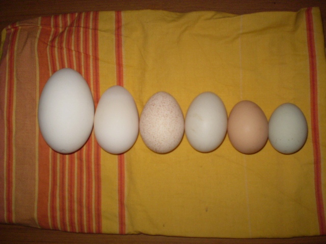 Allora da sinistra verso destra: Oca, Anatra muta, faraona, anatra comune, ovaiola(gallina), gallinella nana