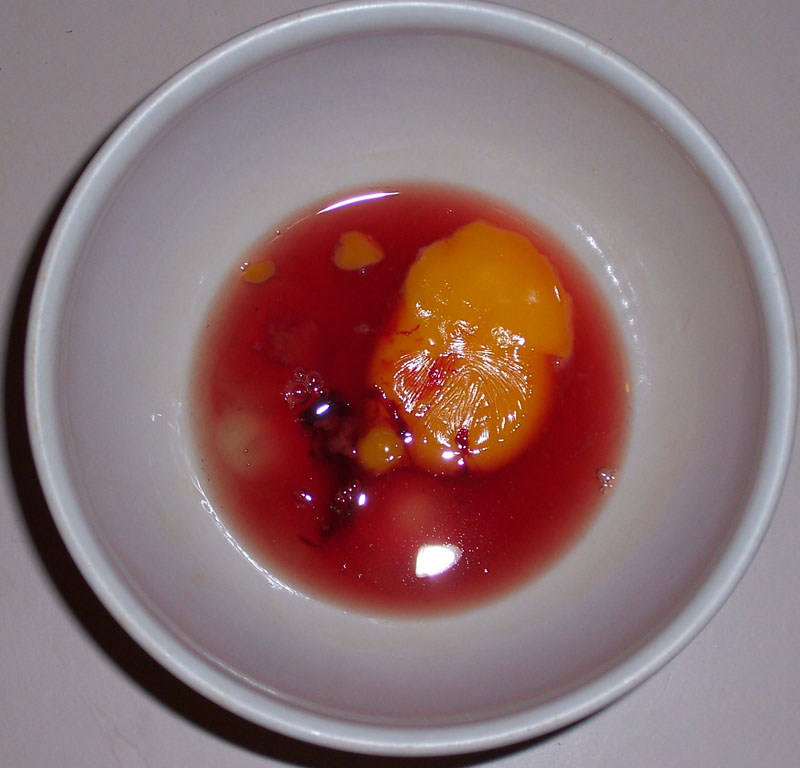 Ciao a tutti, stasera mi si è rotto per sbaglio un uovo di gallina livornese bianca e l'interno non era dei migliori. Il tuorlo era normale e l'albume era molto liquido e color sangue, come si può vedere dalla foto. Secondo voi da cosa può dipendere? Grazie e ciao