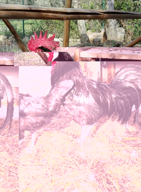bargigli del gallo e orecchioni allungati non tipici della razza e presenza di muffa bianca sotto l'occhio tradiscono l'incrocio con la Spagnola