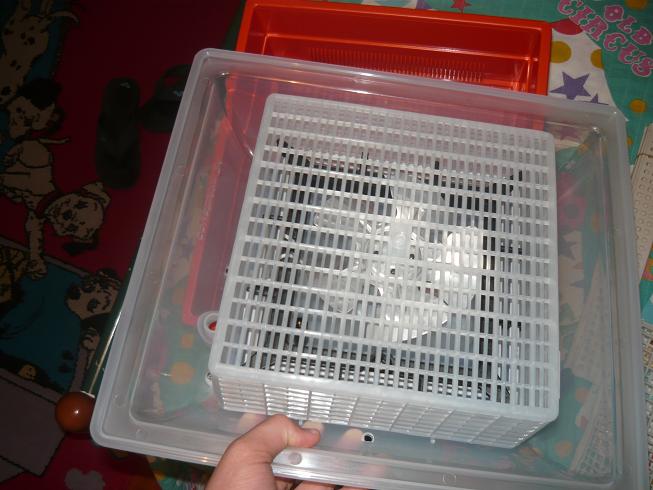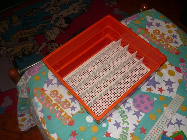 1) prima di montare la griglia sulla quale metterai le uova, metti una seconda vaschetta di plastica sul fondo dell'incubatrice (che dovrai comprare a parte, costa intorno ai 2 €), che dovrai riempire nei tre giorni precedenti la schiusa per aumentare l'umidità. Ti conviene posizionarla di fronte a quella preesistente, dove si trova il tirante girauova, in modo che avrai lo spazio necessario con un imbutino di poterla riempire senza dover rimuovere le uova.
