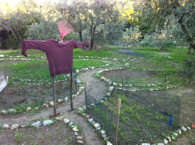 Lo spaventapasseri funge in realtà da spaventalepri (ci sono molti buchi nel recinto).