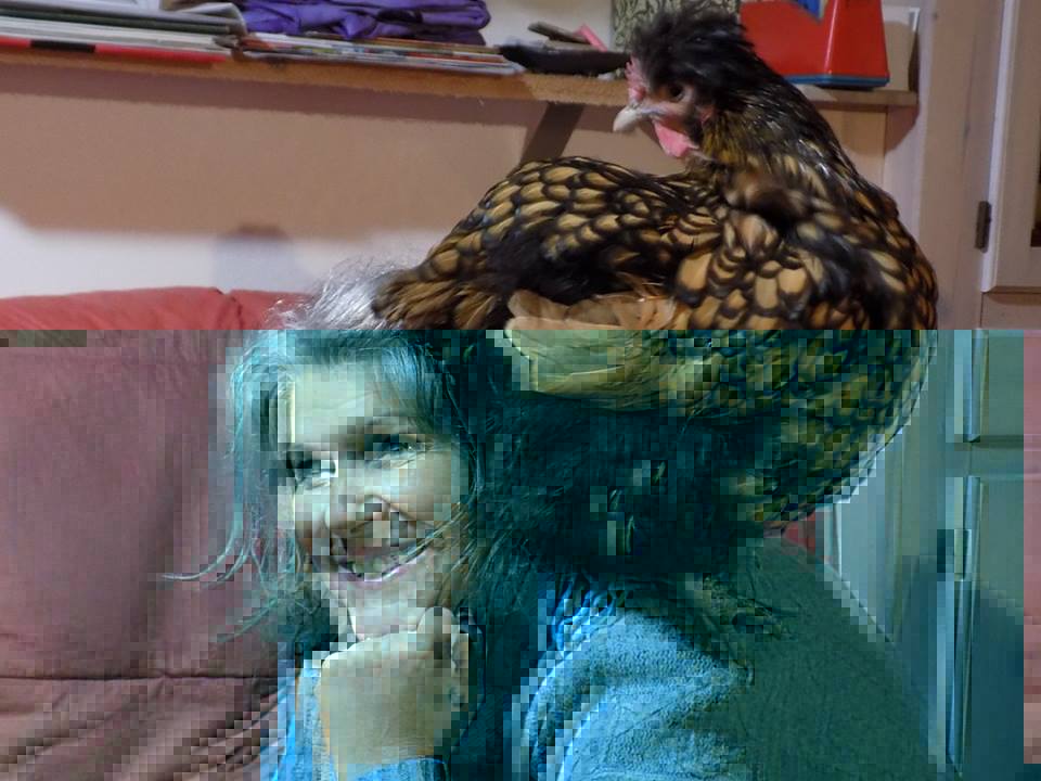 Ora è una...GATlina: viene in braccio, gira per casa, si polleggia sulla spalla. E' completamente e vistosamente piumata, col disegno della Wyandotte nero oro, ma nulla a che fare con la forma fisica. E grande, con una foltissima minigonna di piumino, con una vistosa cresta e una bella "criniera" sulla testa e ci tengo a continuare ad allevarla in maniera vegana per quanto mi compete, ma secondo natura per quando se ne sta fuori a razzolare