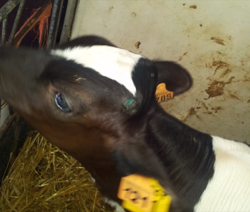 Oggi ero in una fattoria ed ho visto un vitello che dove presumo un giorno debbano crescere le corna aveva una specie di foro dal quale si intravedeva l'interno verde....
