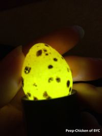 Stasera ho riprovato a sperare alcuni ovoni e in uno mi pare di aver visto l'embrione. C'è una bella camera d'aria e il colore interno è rosato. Come dicevo, è molto difficoltoso sperarle visto che hanno tantissime macchie scure...