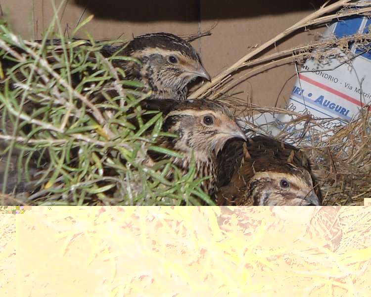 Ecco le quagliette. Sono Giapponesi, le ho messe con i miei uccellini esotici su consiglio del precedente proprietario, si usa spesso tenere le quaglie sul fondo delle voliere...almeno nell'ambiente degli allevatori di uccelli