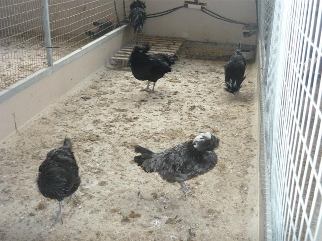 In primo piano un Olandese blu a ciuffo bianco . I soggetti neri potebbero essere delle Padovane nere o delle Olandesi col ciuffo nere . Per distinguerle basta vedere se hanno i bargigli (Olandesi) o altrimenti una folta barba di piume ( Padovane). Consulta anche il nostro atlante razze .....